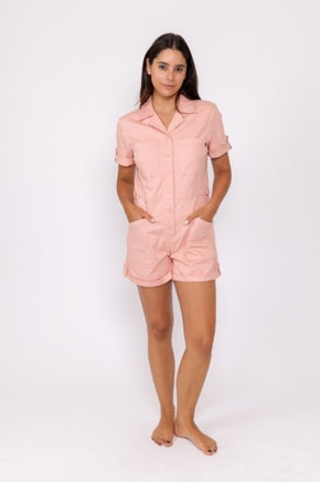 PAINTERS STYLE COLLARED ROMPER WITH FRONT AND BACK POCKETS, BUTTON DOWN FRONT, ROLLED HEM AND ADJUSTABLE WAIST BUTTONS
